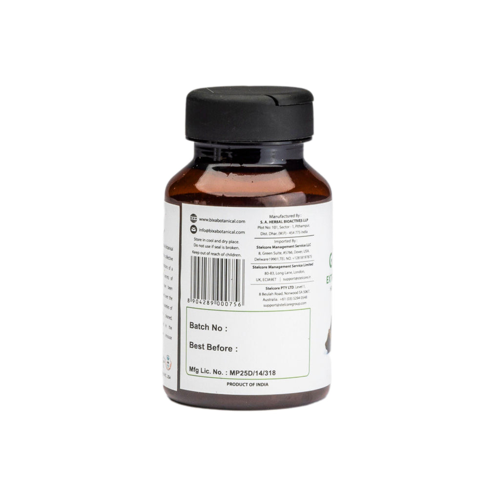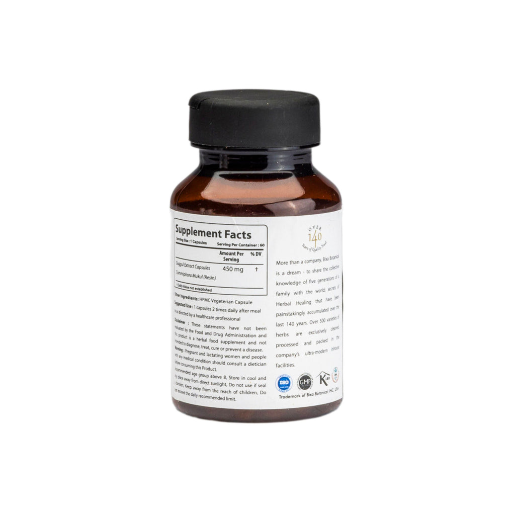 Guggul Extract capsule (Commiphora Mukul) In ayurveda very useful to control and support cholesterol level & Lipid Metabolism. In Ayurveda Gum Guggul is also known by the names Guggul, Indian Bedellium and has Botanical name as Commiphora mukul. Guggul Extract is the sticky oleo gum resin from the Commiphora Mukul tree which plays a major role in the traditional herbal medicine of India. Ayurveda mentions that Guggul Extract is Bitter, astringent in taste, hot in potency and pungent after digestion, helps to improve blood circulation, decreases Vocal cord swelling & improves voice quality. It is digestive, appetiser, removes extra mucous from channels of the body and helps to reduce sugar levels.