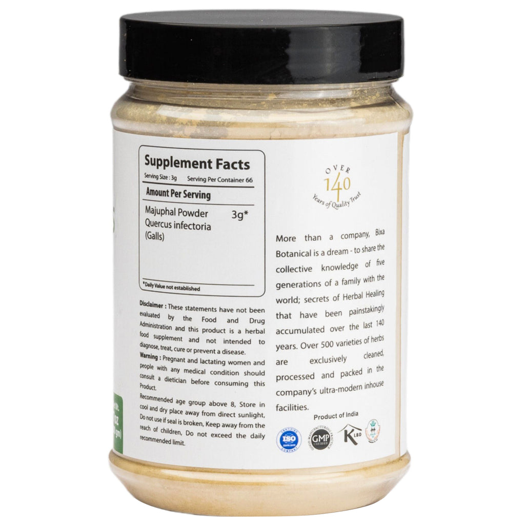 As per Ayurveda Majuphal is astringent, dry and light in nature; cool in potency and helps to pacify pitta & kapha. In Ayurveda it has been successfully used for controlling loose motions in intestinal problems, piles, Women gynaecological irregular discharges, dental infections and swellings in the gums.
