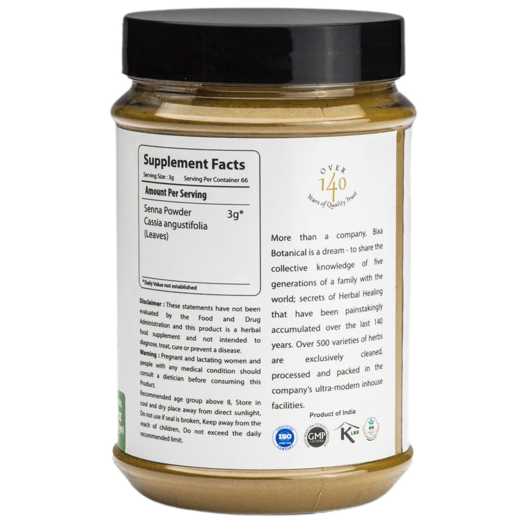 Senna leaves is generally used for its laxative properties. In scientific study of Senna, anthraquinones, sennosides, numerous minor sennosides have been identified, and all appear to contribute to the laxative effect. These compounds work as a laxative by smoothing & relaxing the tissues, as digested food moves through the intestines. It helps to eliminate Vitiated & putrefied Pitta through motion and gives relief in fever caused by excessive Pitta.