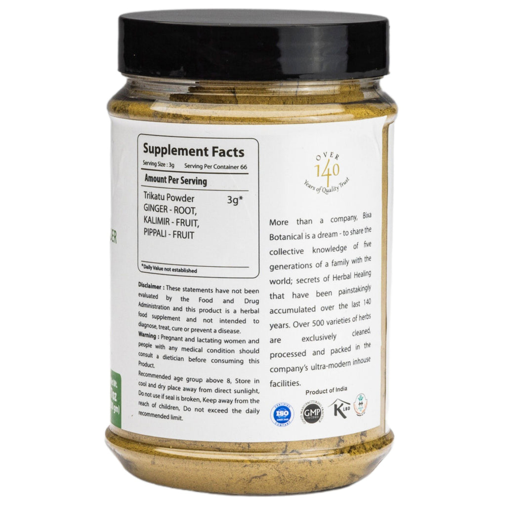 Trikatu churna is a popular Ayurvedic formulation used in Ayurvedic medicine. As the name suggests, trikatu is a combination of three (tri) spices or herbs that are hot (katu). Trikatu powder is a combination of 3 botanical herbs powder – Soonth (Sunth/ Ginger – Zinziber officinale), Kali miri (Black pepper – Piper nigrum), Pippali (Long pepper –Piper longum), in equal quantity.